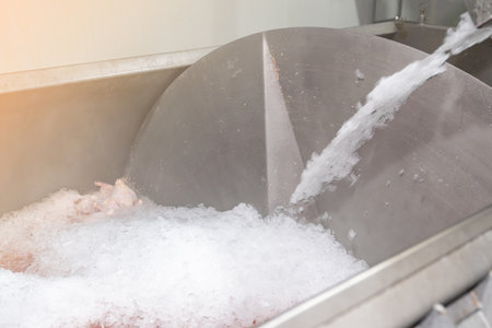 Chicken carcasses were cooled with cold water and ice in chiller tanks.