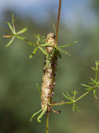 Closeup of caterpillar of the bedstraw hawk-moth on the white bedstraw branch