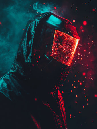 A spaceman or astronaut, illuminated by vibrant neon lights that reflect off their helmet and suit.