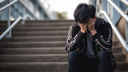 Asian miserable depressed man sit alone with city background. Depression and mental health concept.