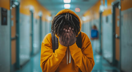 Sad unhappy teenage boy covered his face with hands standing alone in school corridor. Stress, bullying and mental problem in childhood. Generative ai.