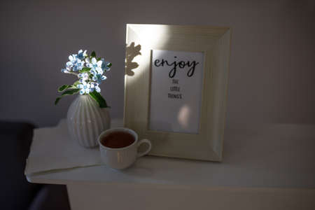 Flower hackelia velutina in a white fluted vase in the style of the seventies, a photo frame with the words Enjoy, and a cup of coffee on the dresser. Scandinavian style