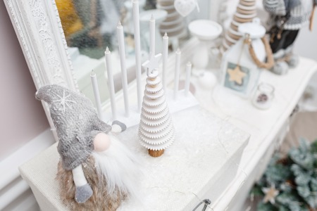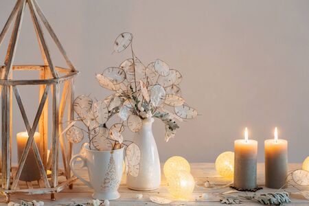 Christmas cozy winter home decor, scandinavian style. New year interior decorations. Golden paper snowflake on wall, pine branch in vase, decorative ceramic ball, candle. Composition on the table. High quality photo