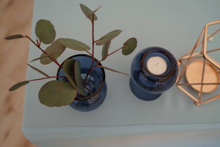 Home decor on table. Vertical photo of comfortable living room with modern and loft interior design, painting in frame, houseplant, candles, vase against concrete white copy space wall