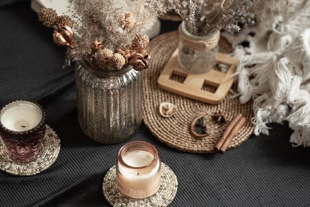 Still life cozy house with decorative details in the interior . Household items and comfort. Candles and a book lie on the bed in the living room.