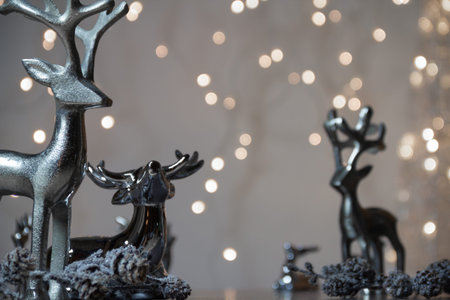 Silver Reindeer and Beautiful Fairy Lights in the Background. Shiny lights and snowflakes. Front view Christmas decoration. Copy space for text