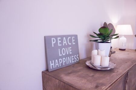 hand-painted motivational wooden vintage board with text Peace, love, happiness