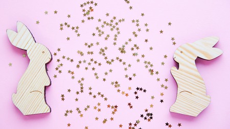 Banner with rabbit bunny and bird shaped forms for gingerbread or cookies decorated with colorful balls inside on trendy blue background with copy space for your creative design. Easter concept