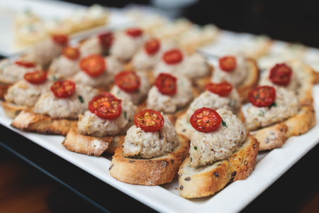 Detail of a canapes of a meal at an event, wedding, meeting or congress with food. Canapes decorated on the dish