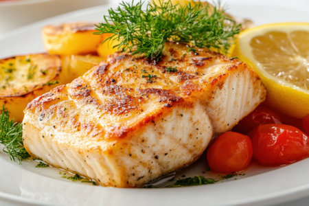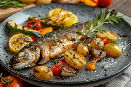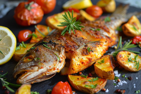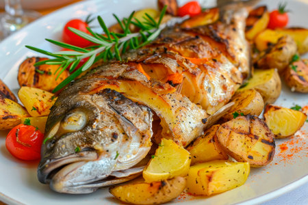 Succulent grilled fish accompanied by roasted potatoes, tomatoes, and herbs
