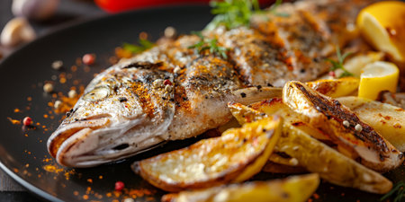 Grilled rainbow trout with potatoes and herbs on black plate, closeup