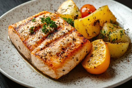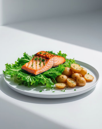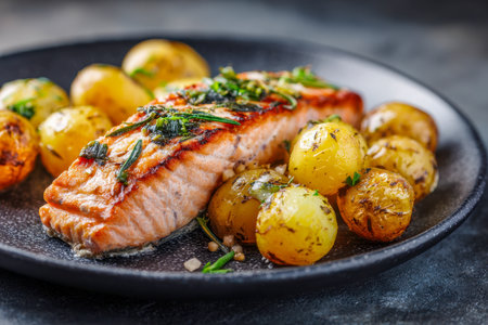 A beautifully plated grilled salmon fillet served with crispy roasted potatoes garnished with fresh herbs, perfect for a healthy and delicious meal.