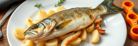 Grilled fish with roasted potatoes and vegetables on the plate