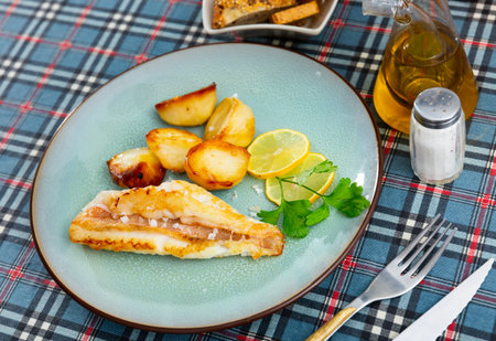 fried fish steak on a plate with potatoes, lemon, greens. Served