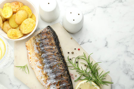 Homemade seafood dish. Tasty roasted mackerel with spices and potatoes on white marble table, flat lay. Space for text
