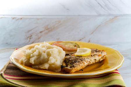 Typical czech cuisine zander fillet on garlic with mashed potatoes