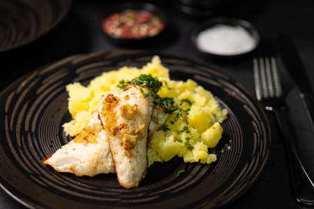 Golden brown fried fish fillet garnished with herbs alongside creamy garlic butter potatoes and lemon wedge. A delicious dish presented on a dark plate for an appetizing look.