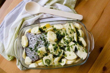 Fish filet with potatoe and parsley ready for baking on wooden table background