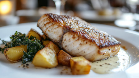 A close-up of a juicy fish steak on a white plate, with a crispy sear and a drizzle of sauce, paired with roasted potatoes and greens