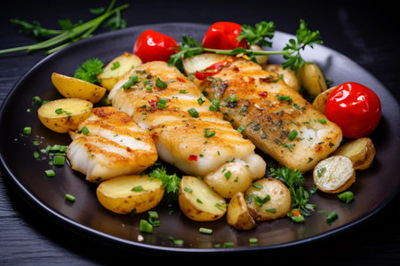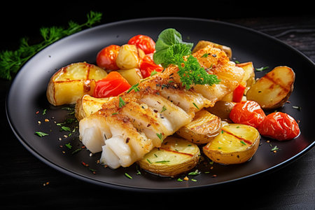 Grilled code with vegetables on the plate on black rock background, generative AI