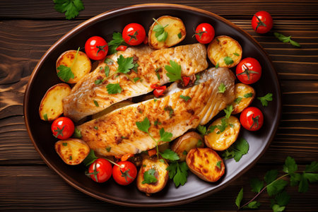 Delectable Hake Fish Fillet - Succulent Roasted Tomato and Potato Delight! [Top View on Wooden Background]