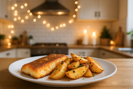 Christmas Grilled fish with potato wedges on kitchen counter in warm lighting setting illustrating cozy home dining experience.
