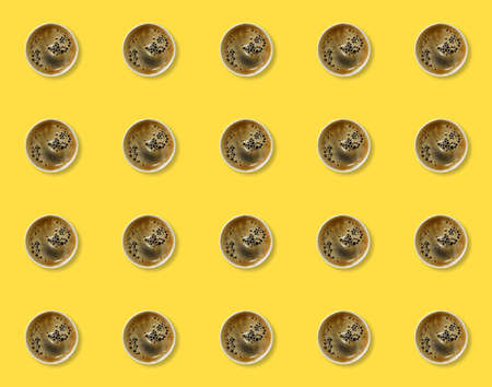 Pattern with fragrant frothy coffee in paper cups on a pale yellow background. Top view