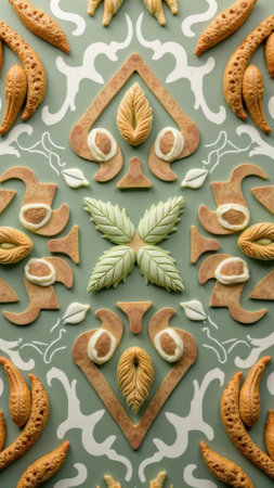 Ornate geometric pattern with decorative pastry featuring leaves and swirls on green background. That the image is generated using AI.