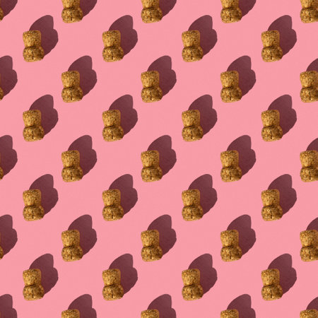 Creative seamless pattern of champagne cork popcorn on a pink background with hard light