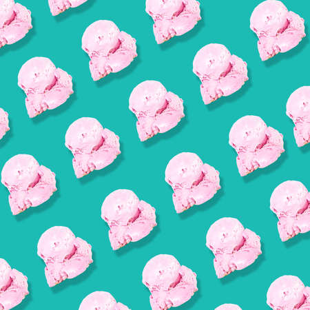 Pink strawberry cone ice cream pattern on pastel green background. design flat lay
