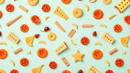 Photo in the form of a seamless pattern. Orange color crispbreads for healthy food with shadows on a colored lilac background.