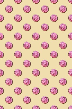 Pattern of cupcakes with pink cream on a light yellow background. The concept of a holiday, party, sweets, unhealthy food. Top view, flat lay, minimalism.