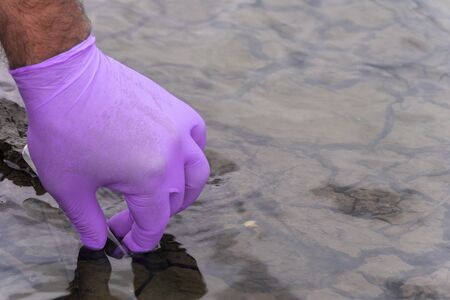 A water sample from the river. Hand in glove collects water in a test tube. ecology concept