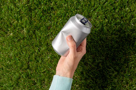 close up of hand removing used tin can from grass