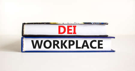 DEI diversity equity inclusion workplace symbol. Books with words DEI workplace on beautiful white background. Business DEI diversity equity inclusion workplace concept. Copy space.