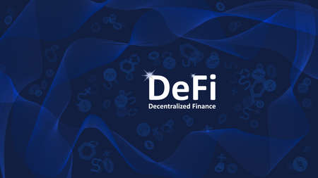 Text DeFi decentralized finance on dark blue background with abstract waves and coin symbols. An ecosystem of financial applications and services based on public blockchains. Vector EPS 10.