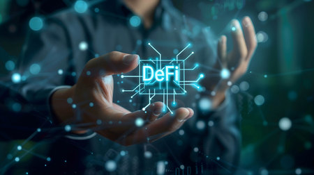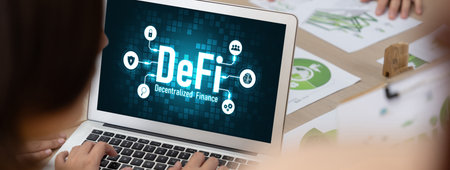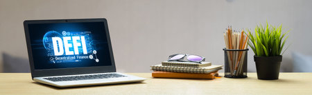 Decentralized finance or DeFi concept on modish computer screen . The defi system give new choice of investment and money saving .