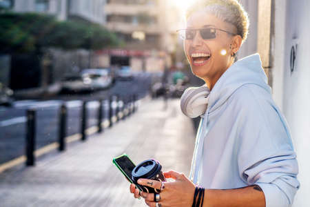 Happy smiling young beautiful hispanic woman walking on the city street with coffee. Girl wearing blue fashionable hoodie, sunglasses and a lot of rings. Real people emotions.