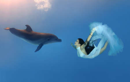 Bride in a wedding white dress with a veil swims to meet a dolphin. Underwater wedding