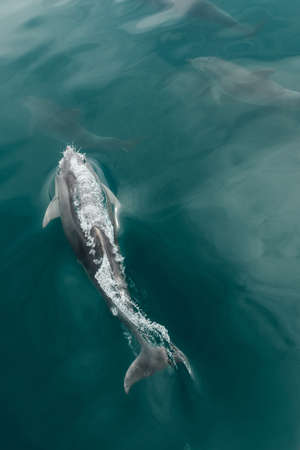 Pod of dolphins swimming in the sea viewed high angle from a boat as they swim by in the cal, blue water, with copyspace