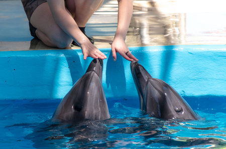 Two dolphins are dancing in the pool. Mammal marine animal.