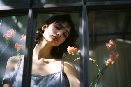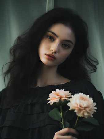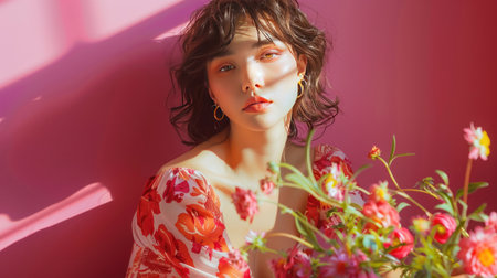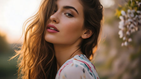 Portrait of a Young Woman with Floral Background, Natural Beauty and Fashion Concept with Soft Daylight AI Generative