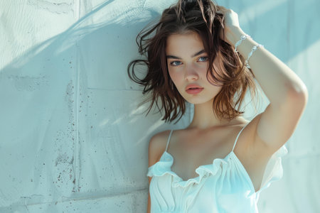 An AI illustration of A beautiful young Caucasian woman stands with confidence in front of a bright blue wall