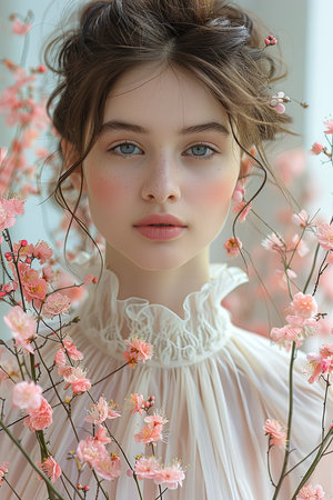 Ethereal Portrait of a Captivating Woman Amidst Blooming Flowers in a Serene Romantic Garden Setting