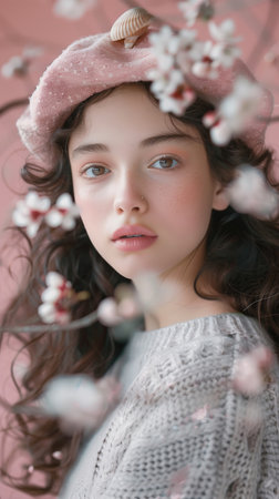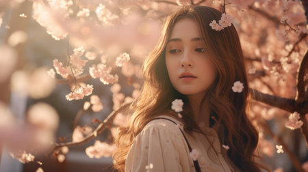Captivating young woman with long curly hair stands amidst a lush garden surrounded by delicate spring blossoms and petals in a serene romantic setting