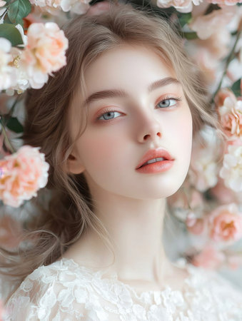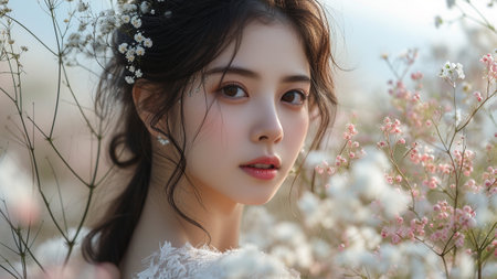 A young woman with wavy hair poses amidst delicate flowers, showing a serene expression and natural makeup. Soft lighting enhances the tranquil atmosphere surrounding her.