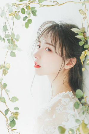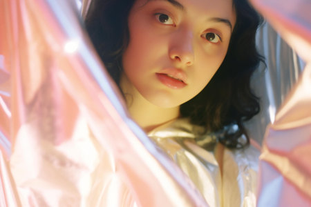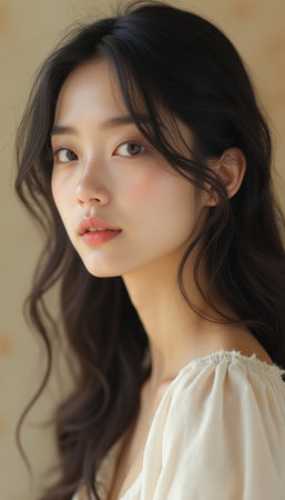 A young woman with long, flowing hair rests her chin on her hands, gazing softly at the camera against a gentle, neutral backdrop. Her delicate features and the ethereal quality of the soft fabric around her create an atmosphere of tranquility and introspection, inviting viewers into a moment of quiet reflection.