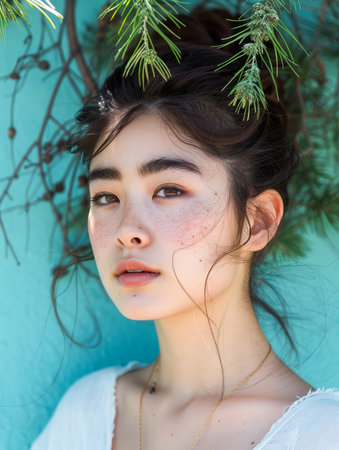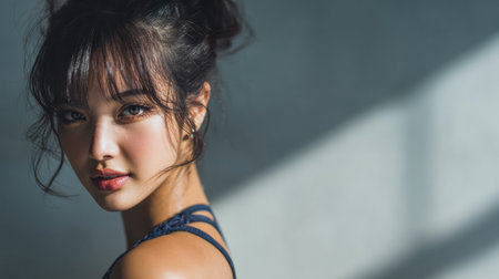 Portrait of a beautiful Asian woman with brown hair and green eyes