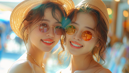 Portrait of two beautiful young women in straw hats and sunglasses.