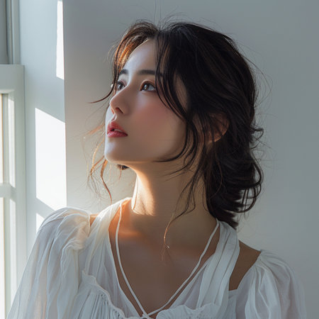 Elegant woman in a white outfit sitting by the window, exuding calm and grace